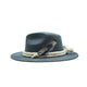 Sombrero 100% hecho a mano de gamuza plana con detalles bordados con hilo metalico y aplicaciones adheribles.