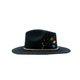 Serenidad que da pie a la inspiración y a los nuevos comienzos. Sombrero artesanal de lana levantadito con cadena chapeada en oro, detalles bordados con hilo metalico y pluma de ganso dorada y faisan plateado. (Unisex).