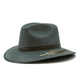 Sombrero de gamuza plana con tira de piel y pluma de pava atigrada.