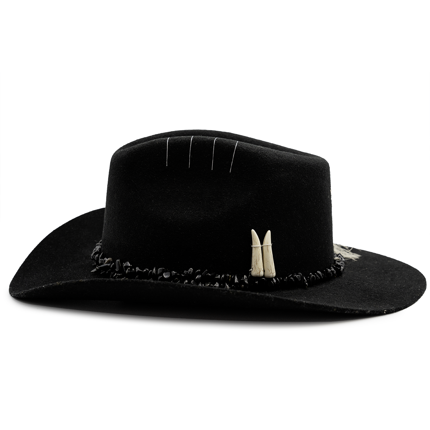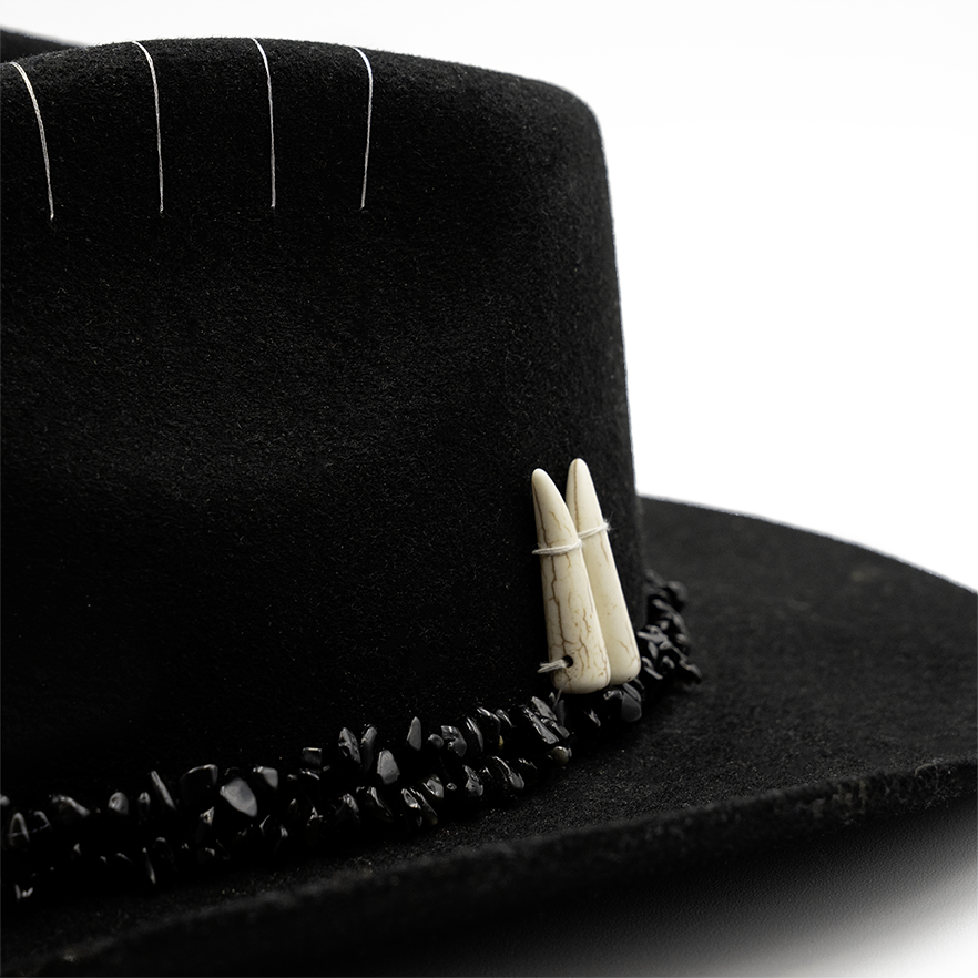 Sombrero 100% hecho a mano de lana levantadita con collares de hilo de cuarzo rosa, detalles bordados y plumas de pavo real blanco, gallina de guinea y pluma de ganso plateada.
